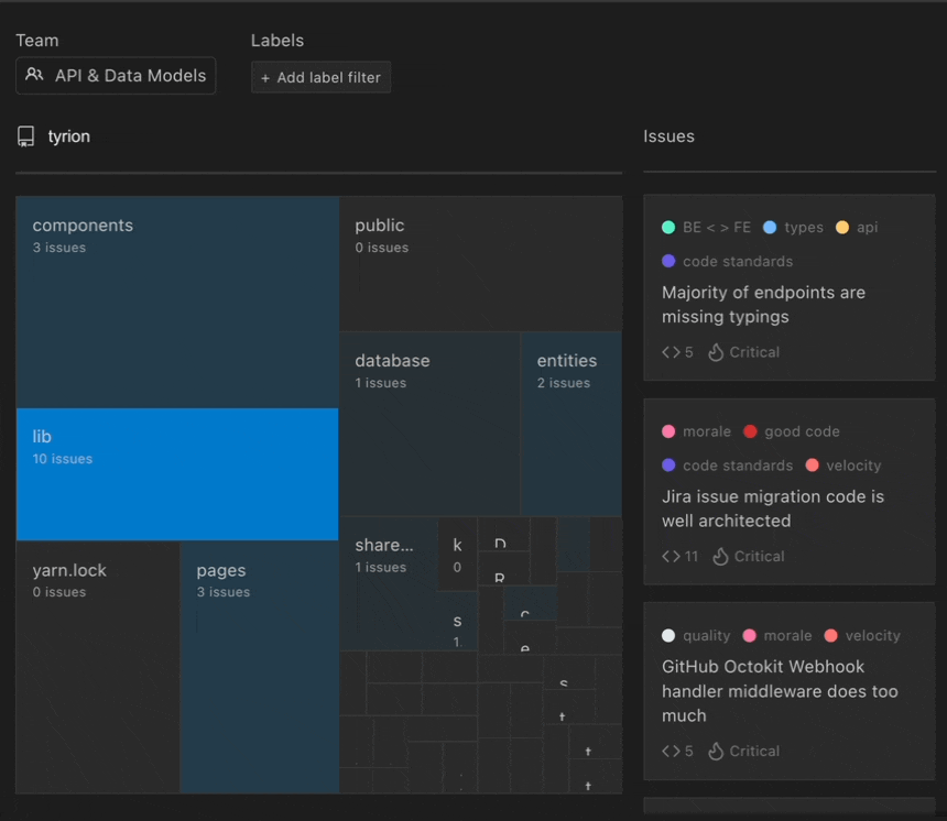 Stepsize’s visualisation tool allows your team to visualise what tech debt exists in each part of your codebase. You can also filter by impact. This is powerful because it allows you to focus on particular themes. For example, you could focus on issues impacting morale, velocity or the database.